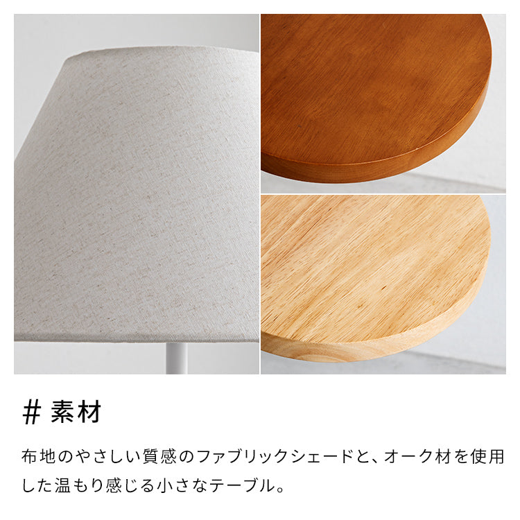 布地のやさしい質感のファブリックシェードと、オーク材を使用した温もり感じる小さなテーブル。