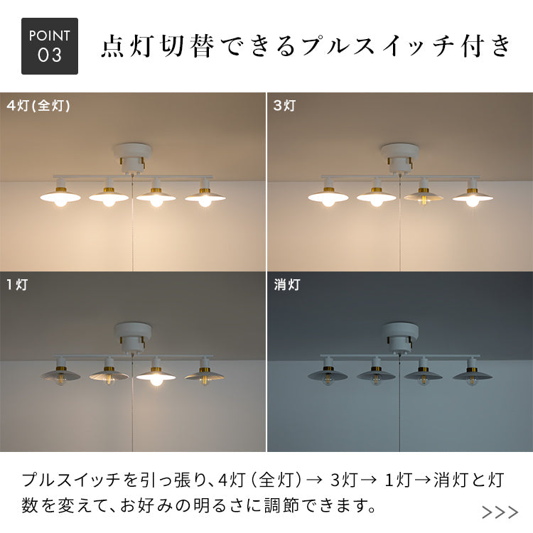 プルスイッチを引っ張り、4灯(全灯)→ 3灯→ 1灯→消灯と灯数を変えて、お好みの明るさに調節できます。