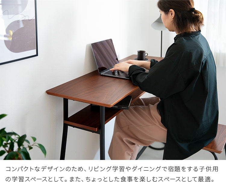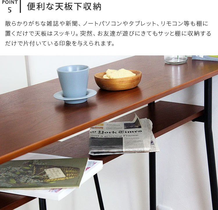 コンパクトながらも、ノートを広げて作業や勉強をしたりするのにちょうどいいサイズです。カフェで勉強するような感覚でご使用いただけます。天板下には収納棚があり、新聞や雑誌、ノートパソコンやタブレットなど日常的によく手に取るものの収納に便利です。